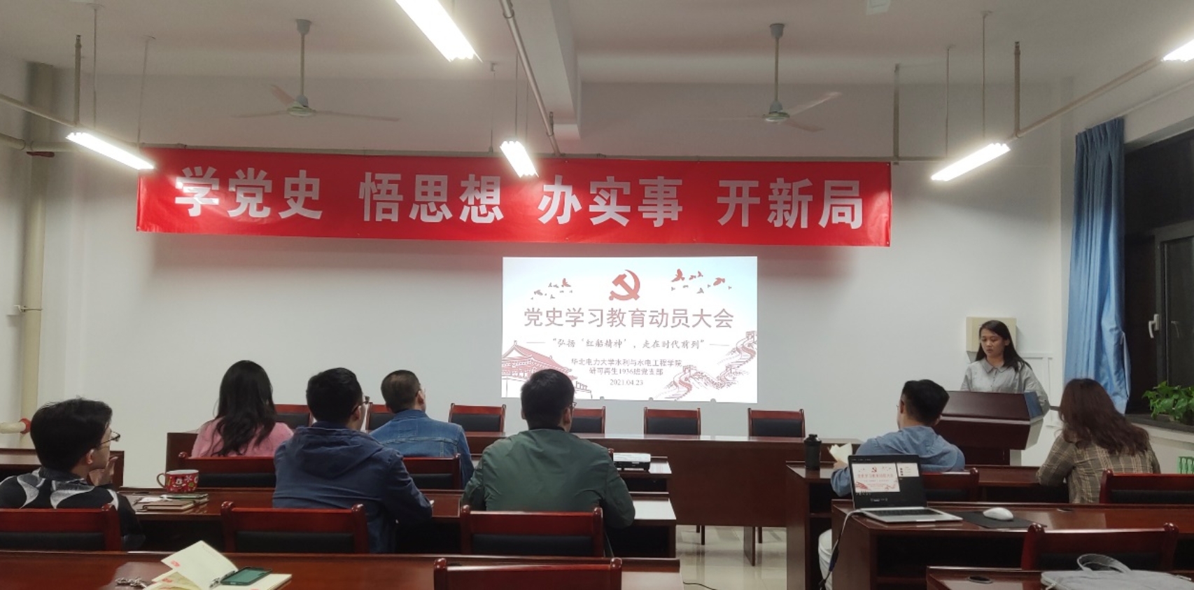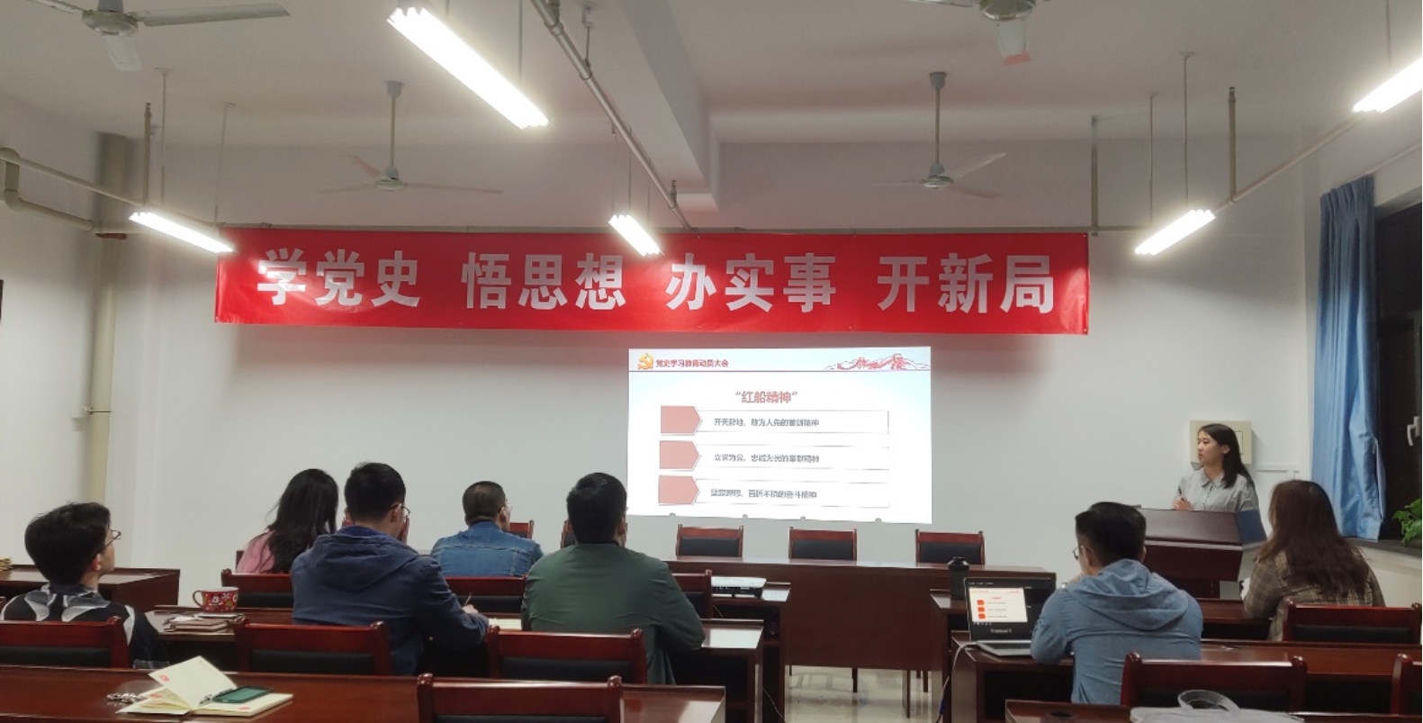 研可再生1936班党支部在主B512召开党史学习教育动员大会,并以“弘扬‘红船精神’,走在时代前列”为主题开展专题学习。党支部全体党员参加会议,会议由党支部组织委员罗诗琦主持。