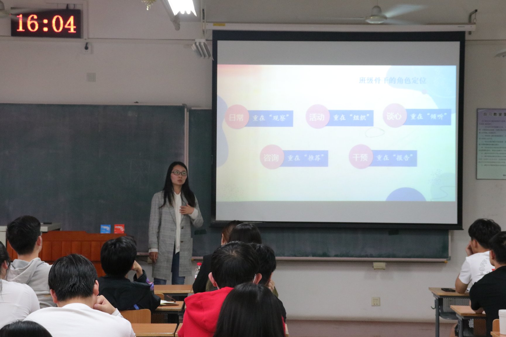 余老师首先通过一个小游戏让大家切身体会到自己作为班级骨干应扮演的角色。接着,她从“找准定位”、“明确要求”、“把握原则”三个方面分别进行了深入的讲解,帮助大家明确自身在班级心理工作中的角色定位、工作要求和基本原则。余老师指出,班级骨干应当在班级中扮演“知心伙伴”、“信息沟通桥梁”、“心理观察员”和“活动组织者”的角色。余老师结合自身从事心理健康教育工作的经验和体会,通过理论阐释和案例讲解,深入分析了班级骨干在心理助人方面的工作职责,同时也阐释了坚持心理助人工作原则的必要性。最后她指出,班级骨干在心理助人工作中既要尽己所能,也要明确边界;既要增强自己的觉察能力,同时也要在适当的时候进行宣泄;要加强学习,在帮助他人的同时实现自我成长;要善于利用身边的资源,并及时向辅导员、班主任以及学校心理健康教育中心求助。