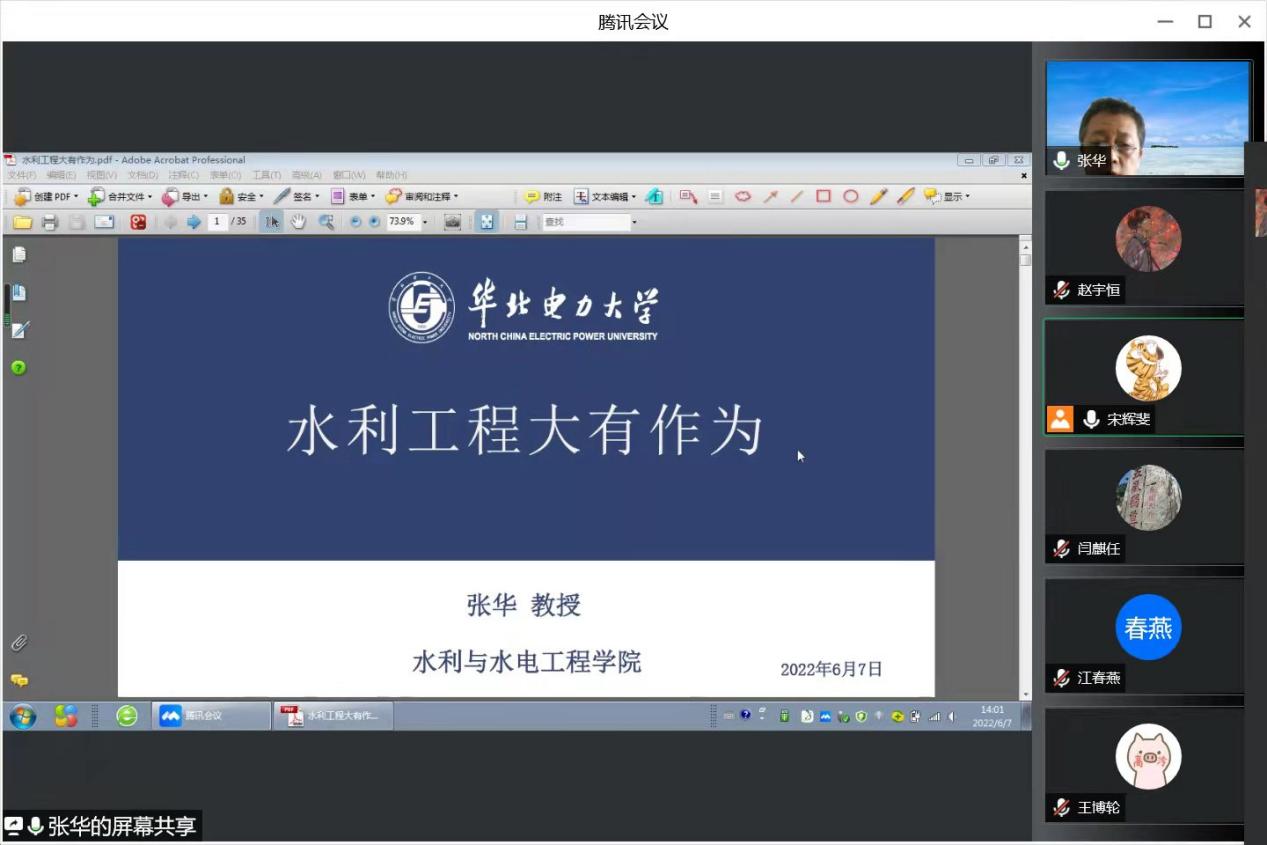 为进一步提高同学们的思想政治素养,营造良好的学风院风,同时激发学生的学习兴趣,引导学生树立正确的人生观和价值观,6月7日下午,澳门六合彩管家婆 于线上举办“学者引航”教育活动第三场报告会,澳门六合彩管家婆 张华教授为2020级和2021级本科生开展了题为“水利工程大有作为”的专题报告,报告会由澳门六合彩管家婆 团委书记宋辉斐主持。