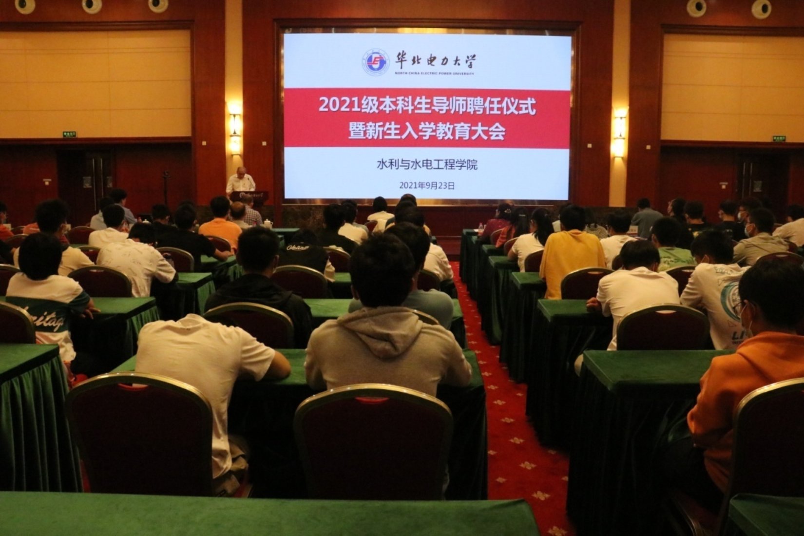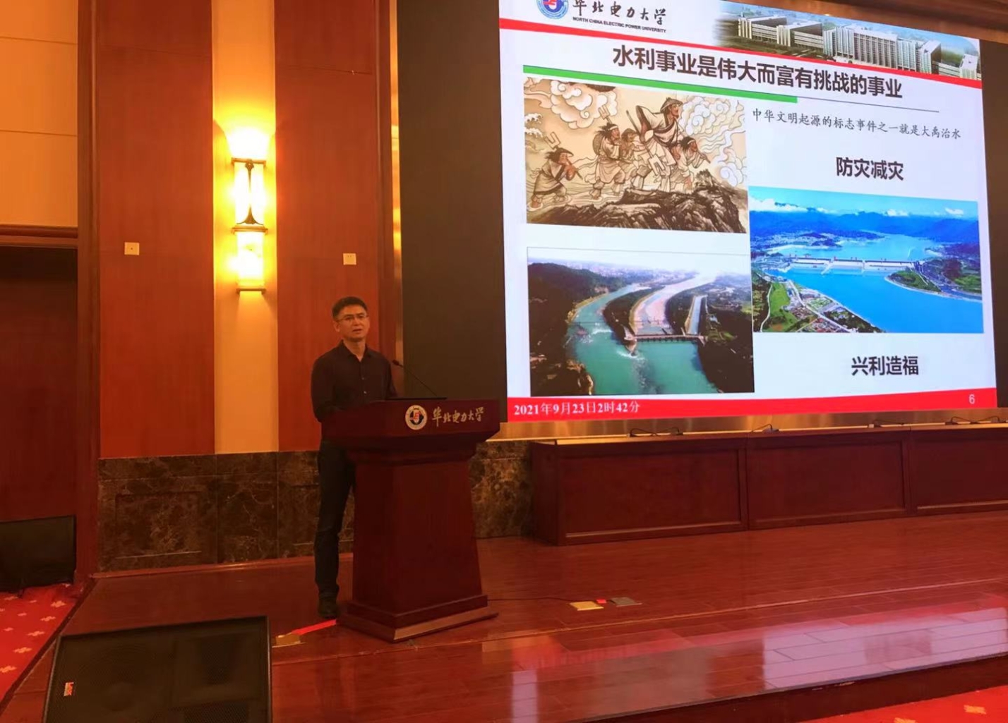 门宝辉教授代表本科生导师发言。他从“拟定目标”、“学会坚持”、“学会自律”和“提升综合能力”四个方面对2021级本科生提出殷切希望。门宝辉衷心祝愿同学们能在华北电力大学的新环境中,秉承“团结、勤奋、求实、创新”的华电精神,做有益于他人、有益于社会、有益于国家的新时代华电水利人。